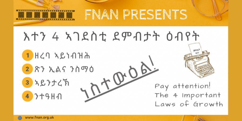 Tigrinya Translation ነስተውዕል! እተን ኣርባዕተ ኣገደስቲ ደምብታት ዕብየት ቀዳማይ፡ ዘረባ ኣይነብዝሕ ካልኣይ፡ ጽን ኢልና ንስማዕ ሳልሳይ፡ ኣይንታረኽ ራብዓይ፡ ንተዓዘብ The 4 Important Laws of Growth (PAY ATTENTION) Number 1: Speak Less. Number 2: Listen More. Number 3: React Less. Number 4: Observe More. Special thanks for Team Fearless for the use of this video this […]
